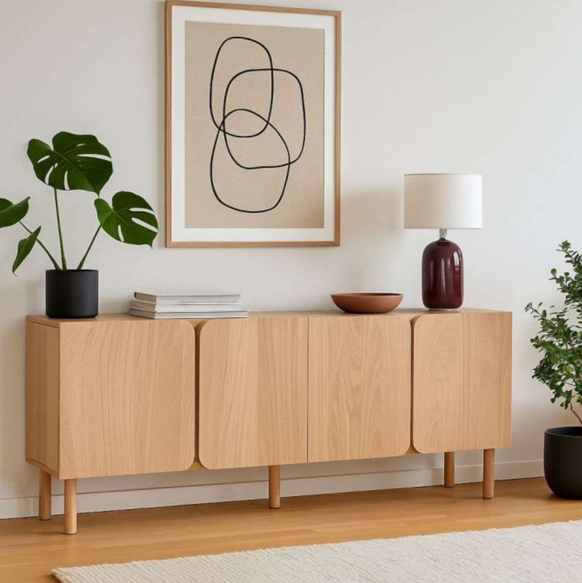 Luna on tyylikäs ja moderni senkki joka on valmistettu vanerista ja kalustelevystä. Senkin alta on helppo siivota kun on korkeat jalat.